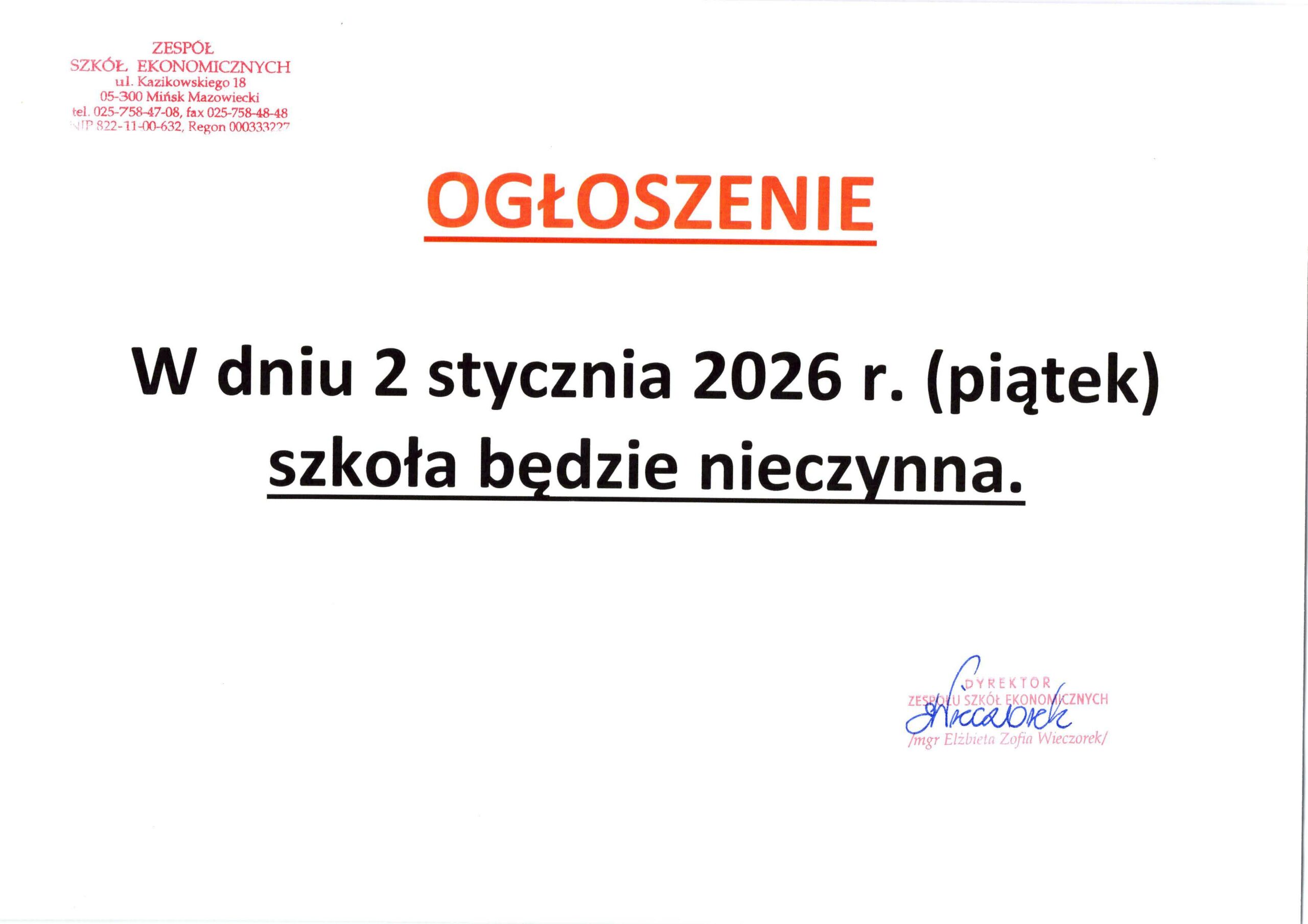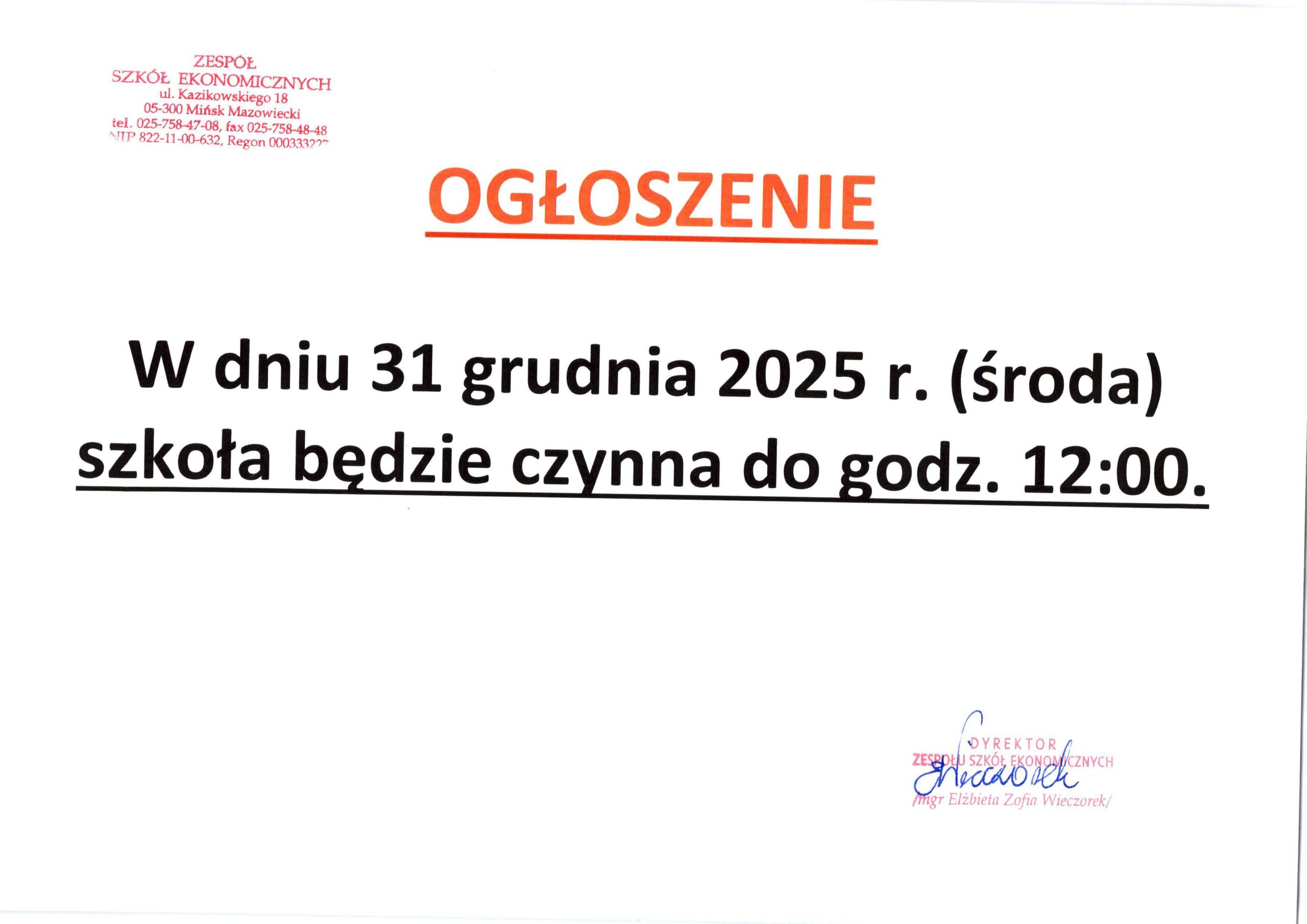 Godziny pracy szkoły 31 grudnia 2025r oraz 2 stycznia 2026r