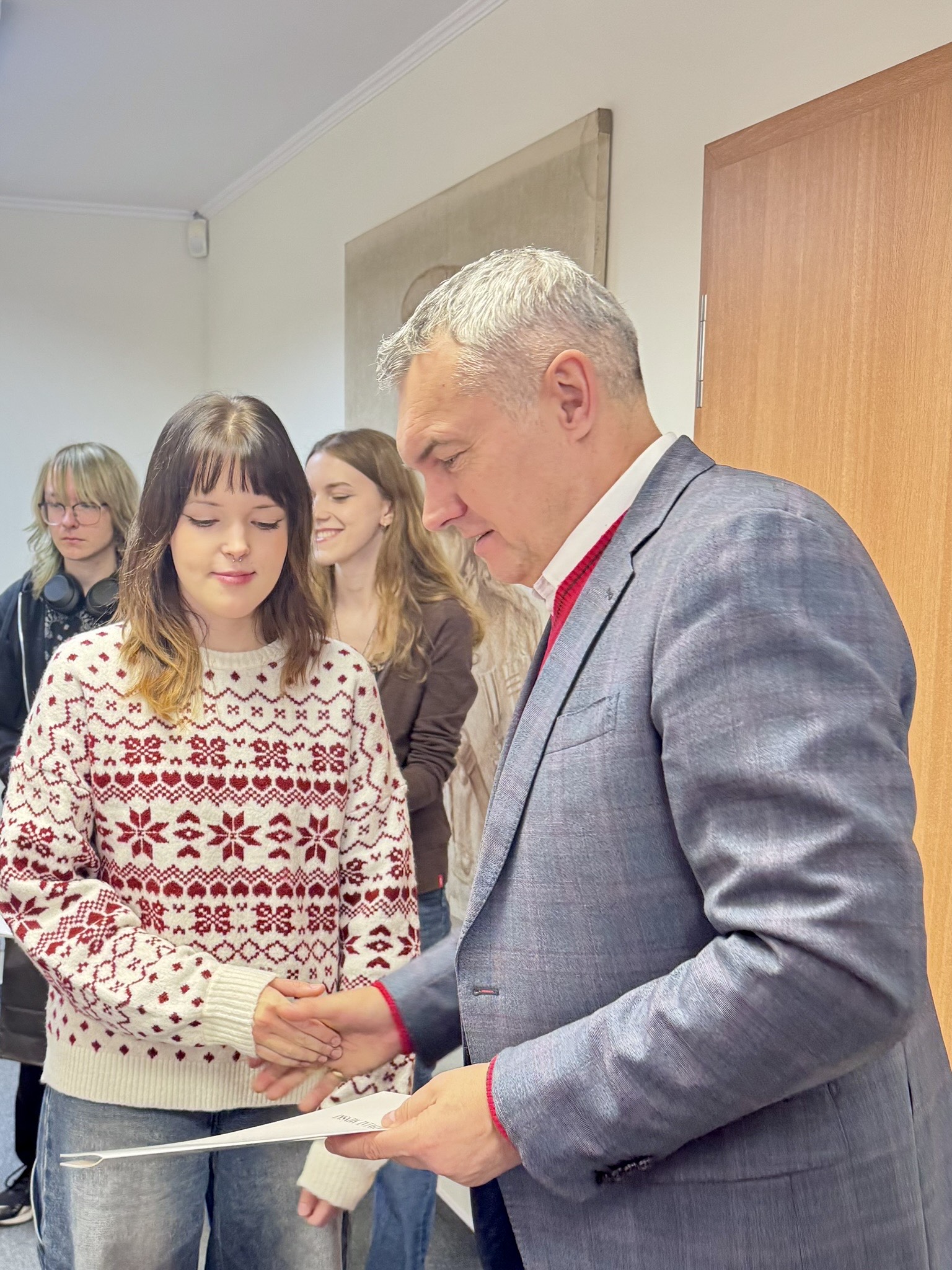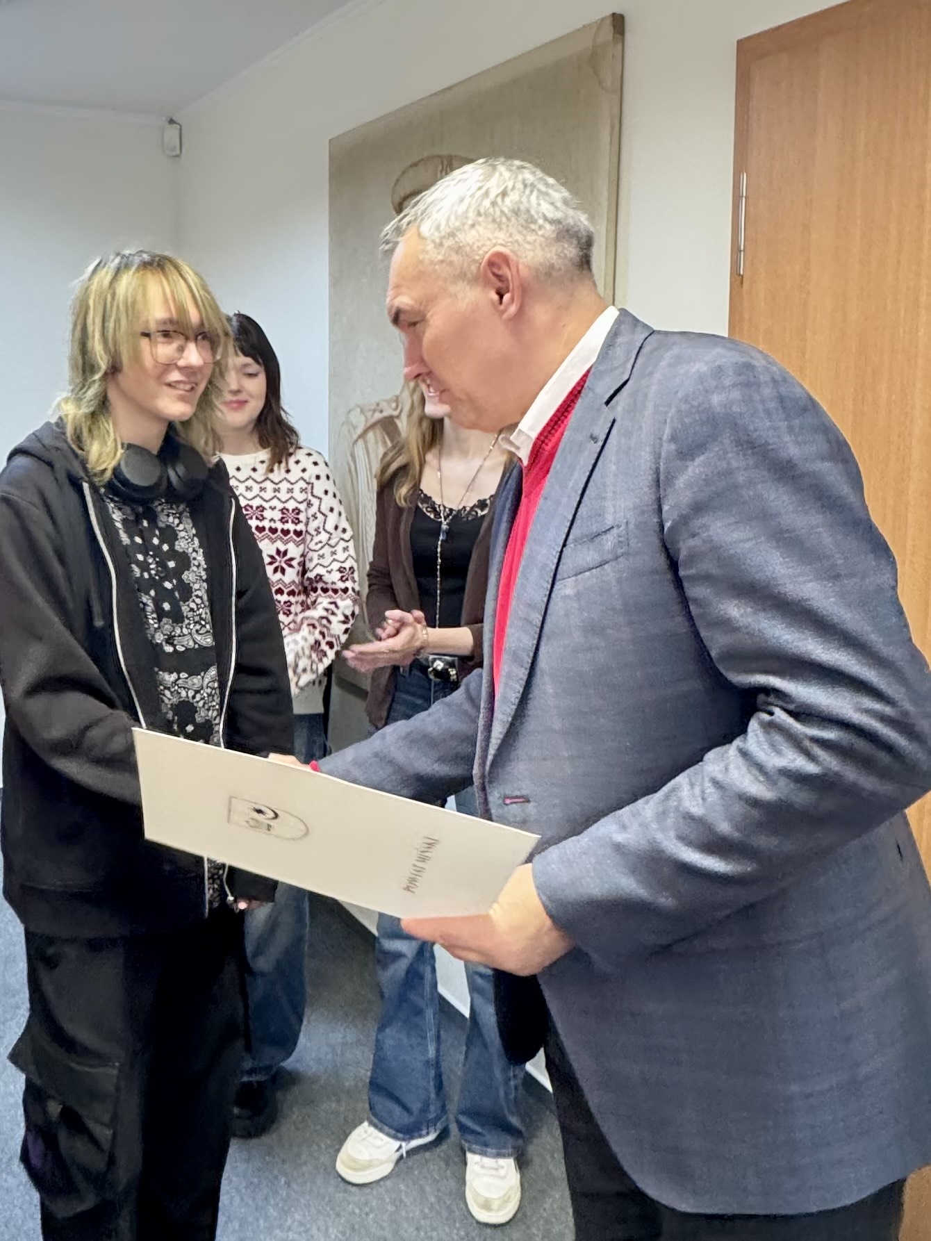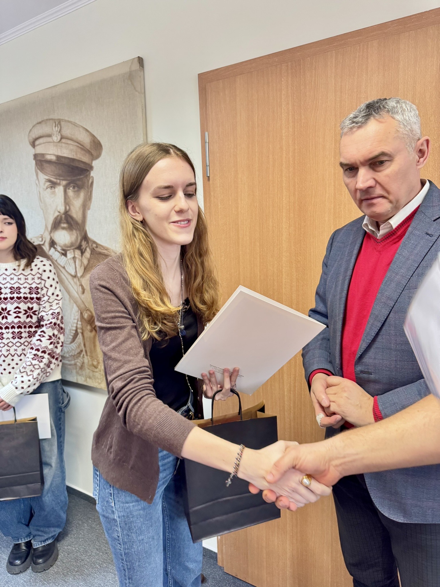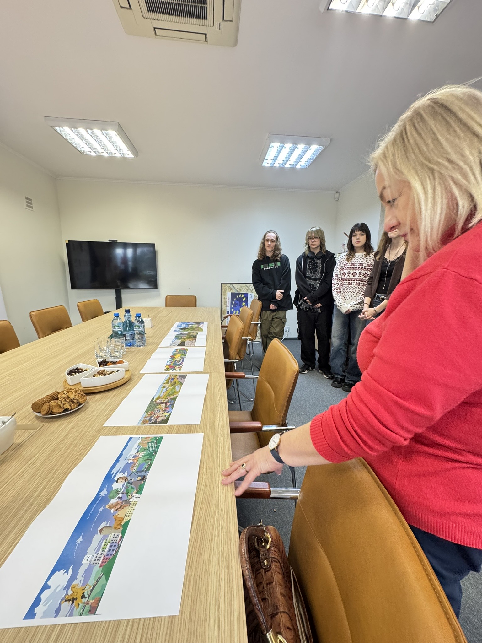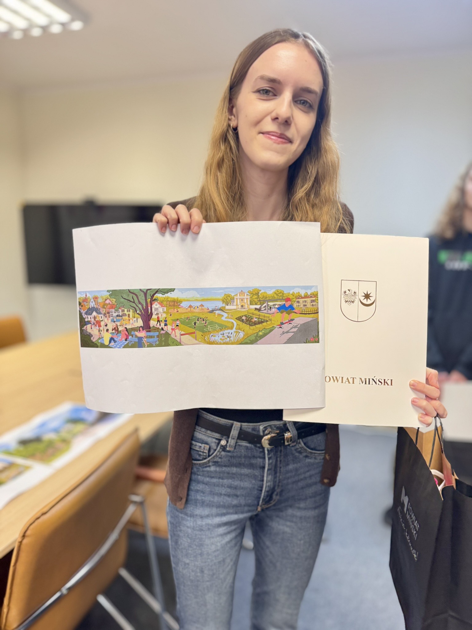 5 grudnia w siedzibie Starostwa Powiatowego Mińsku Mazowieckim Powiat Miński odbyło się podsumowanie konkursu plastycznego na mural pt.:”POMALUJ GABINET STAROSTY”, w którym wzięli udział uczniowie naszego liceum. Projekt muralu musiał uwzględnić atrakcje turystyczne, zabytki architektury, historyczne postacie związane z naszym powiatem itp. Poziom artystyczny prac był wysoki i jury konkursu miało trudność z wyborem tej najlepszej Czworo laureatów konkursu z kl.4P pojawiło się tego dnia w budynku Starostwa w towarzystwie Dyrektor ZSE p. Elżbiety Zofii Wieczorek oraz nauczycielki Rysunku i Malarstwa Kaliny Kurczewskiej-Zagańczyk, która przygotowywała uczniów. Nagrody uczniom wręczyli p.Michał Siemiński (Dyrektor Biura Promocji Starostwa) oraz p.Krzysztof Falkowski (Sekretarz Powiatu Mińskiego). I miejsce i zwycięski projekt to praca OLGI ROGALI, który w najbliższym czasie zostanie przeniesiony na ścianę i na pewno wrzucimy zdjęcia ze skończonej realizacji !!!