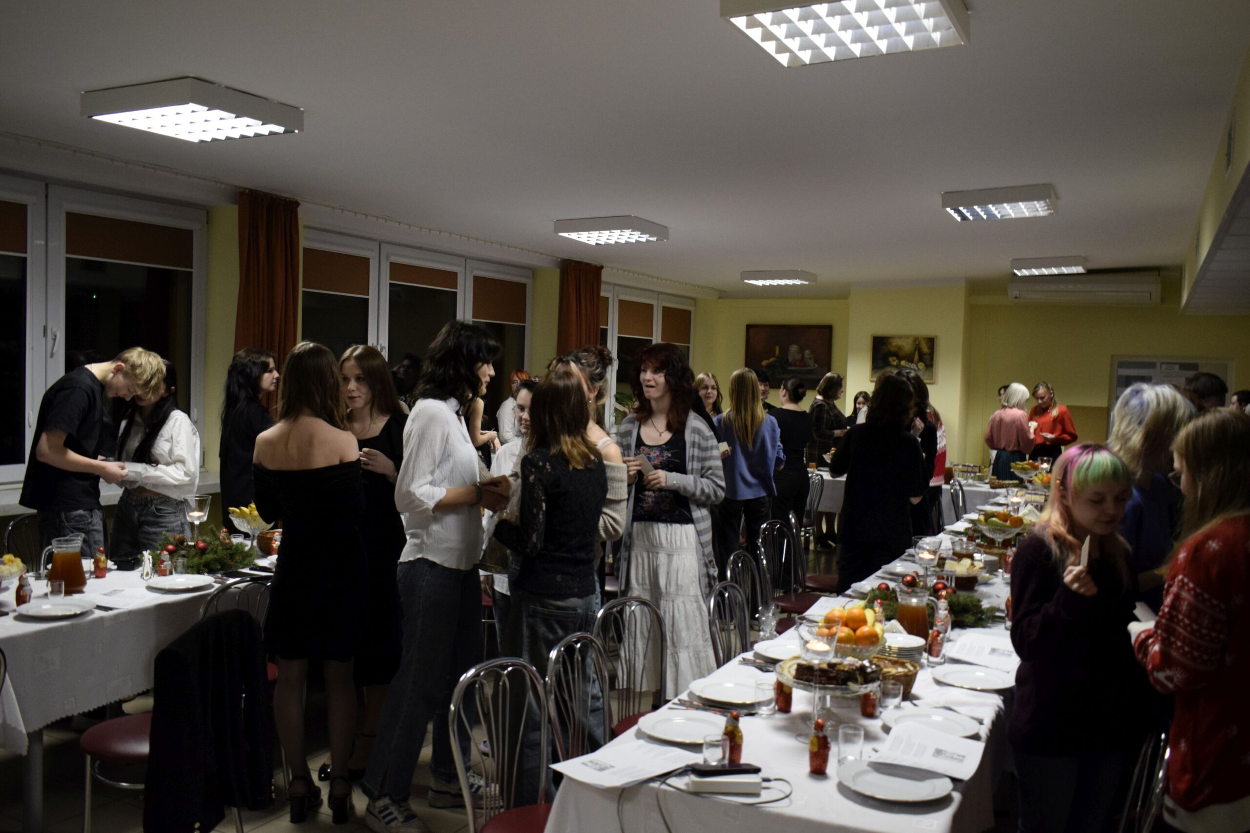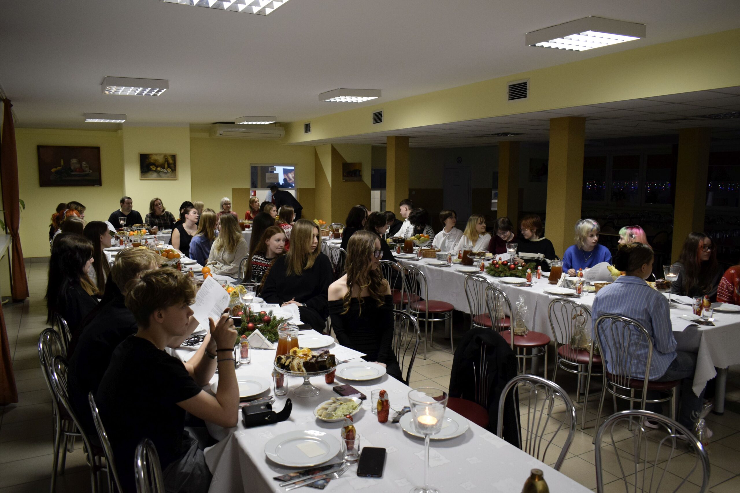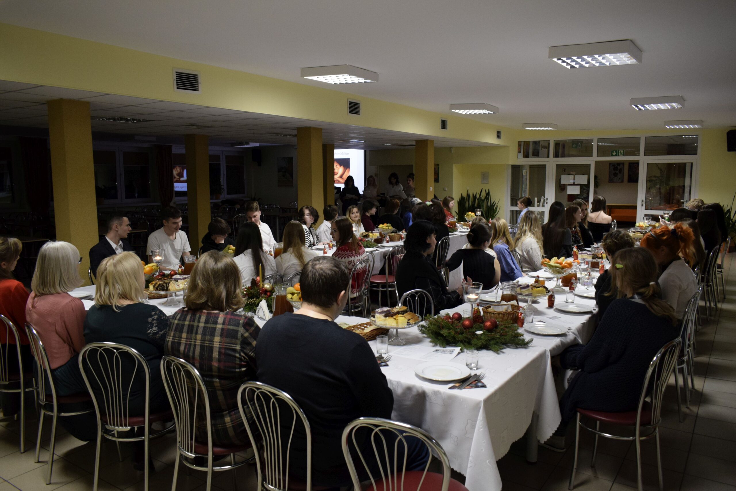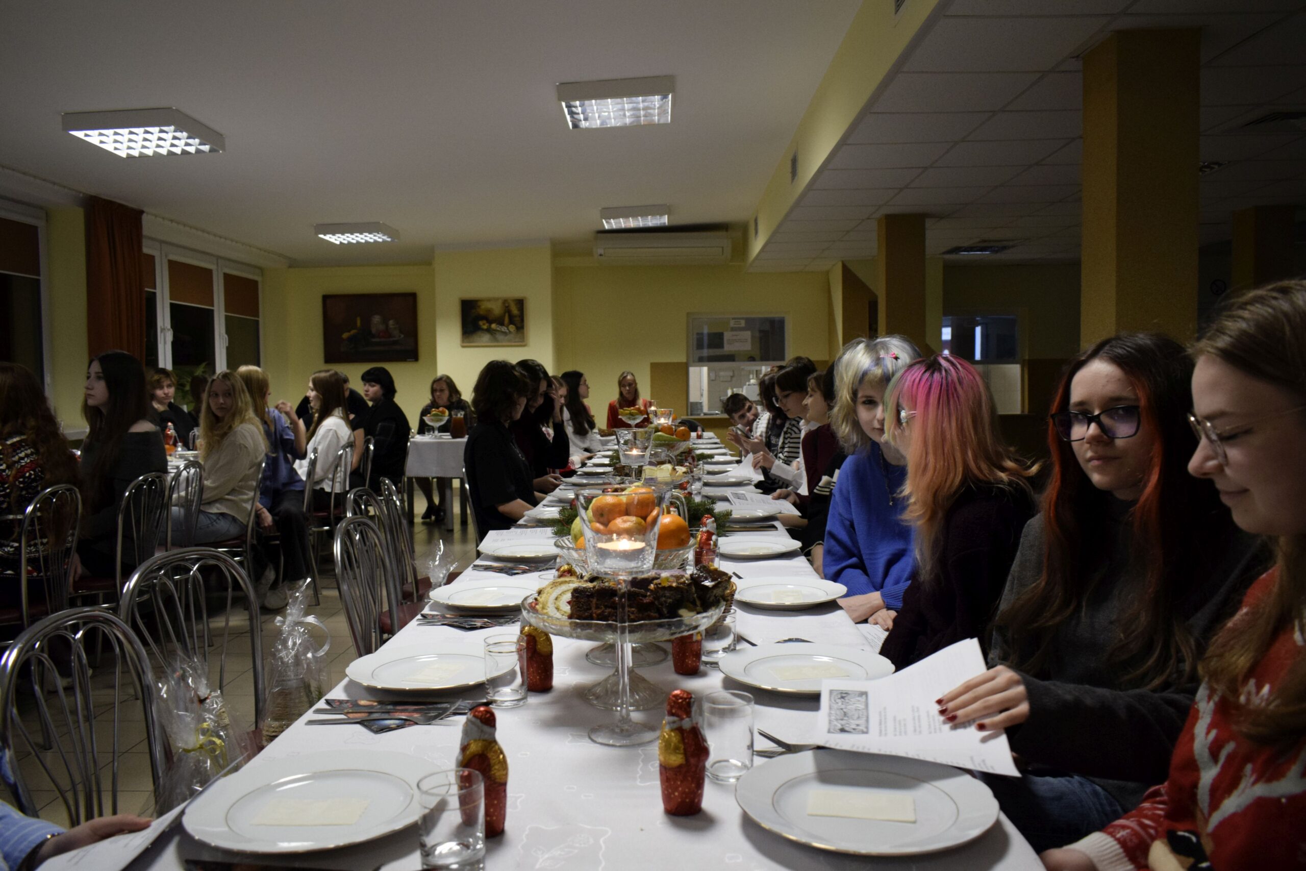 17 grudnia zgromadziliśmy się w naszej społeczności internackiej przy odświętnie przygotowanych stołach na tradycyjnym spotkaniu opłatkowym. Zwyczajem lat ubiegłych zanim wzięliśmy do rąk opłatek, by złożyć sobie nawzajem życzenia, wysłuchaliśmy występu artystycznego przygotowanego przez grupę naszych koleżanek pod kierunkiem p. Krzysztofa Trojana. Był to montaż słowno-muzyczny, w którym teksty prozy, poezji i rozważań Jana Pawła II przeplatały się ze śpiewem kolęd. Na tę okazję powstał zespół instrumentalny, w którego skład weszli: Natalia Dymowska (flet poprzeczny), Antonina Gałązka (gitara basowa), Nadia Kuć (perkusja elektroniczna), Natalia Mucha (skrzypce) i p. Krzysztof Trojan (pianino/organy). Zespół grał kolędy w różnych konfiguracjach instrumentalnych, kilkoro dziewcząt animowało śpiew, a wszyscy uczestnicy kolacji wigilijnej włączali się weń korzystając ze specjalnie przygotowanych na ten wieczór śpiewniczków. Na zakończenie słowa życzeń skierowała do nas p. dyrektor Elżbieta Wieczorek, która zawsze pamięta o nas i towarzyszy nam swoją obecnością w tym świątecznym okresie.