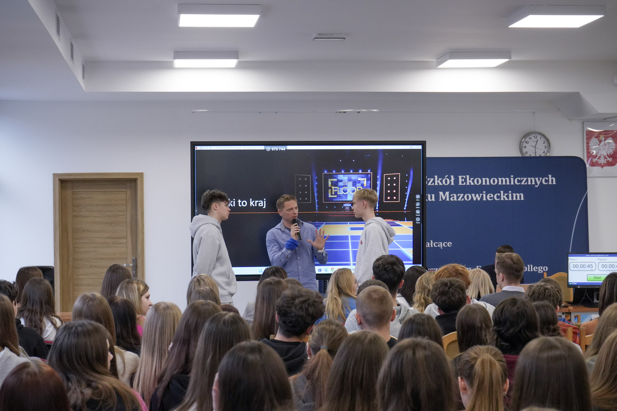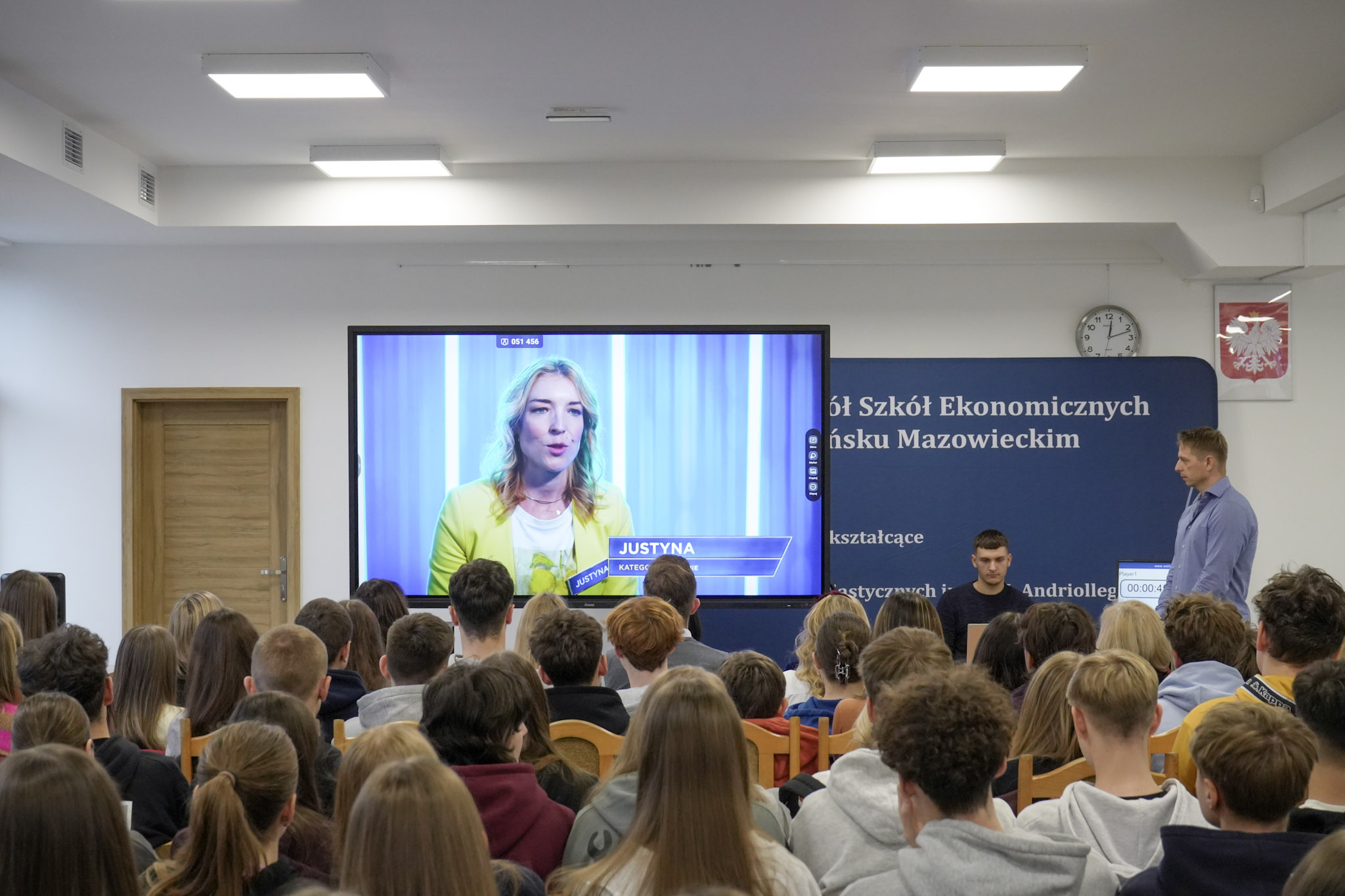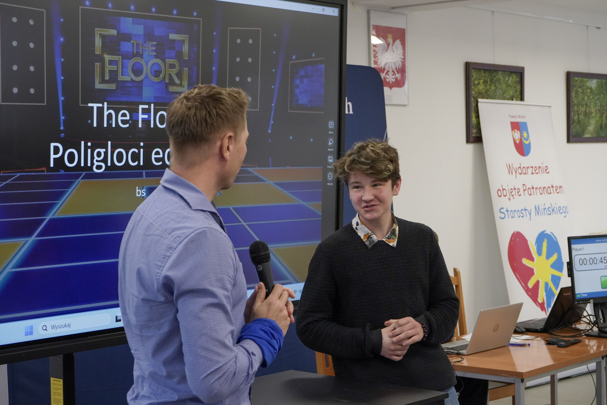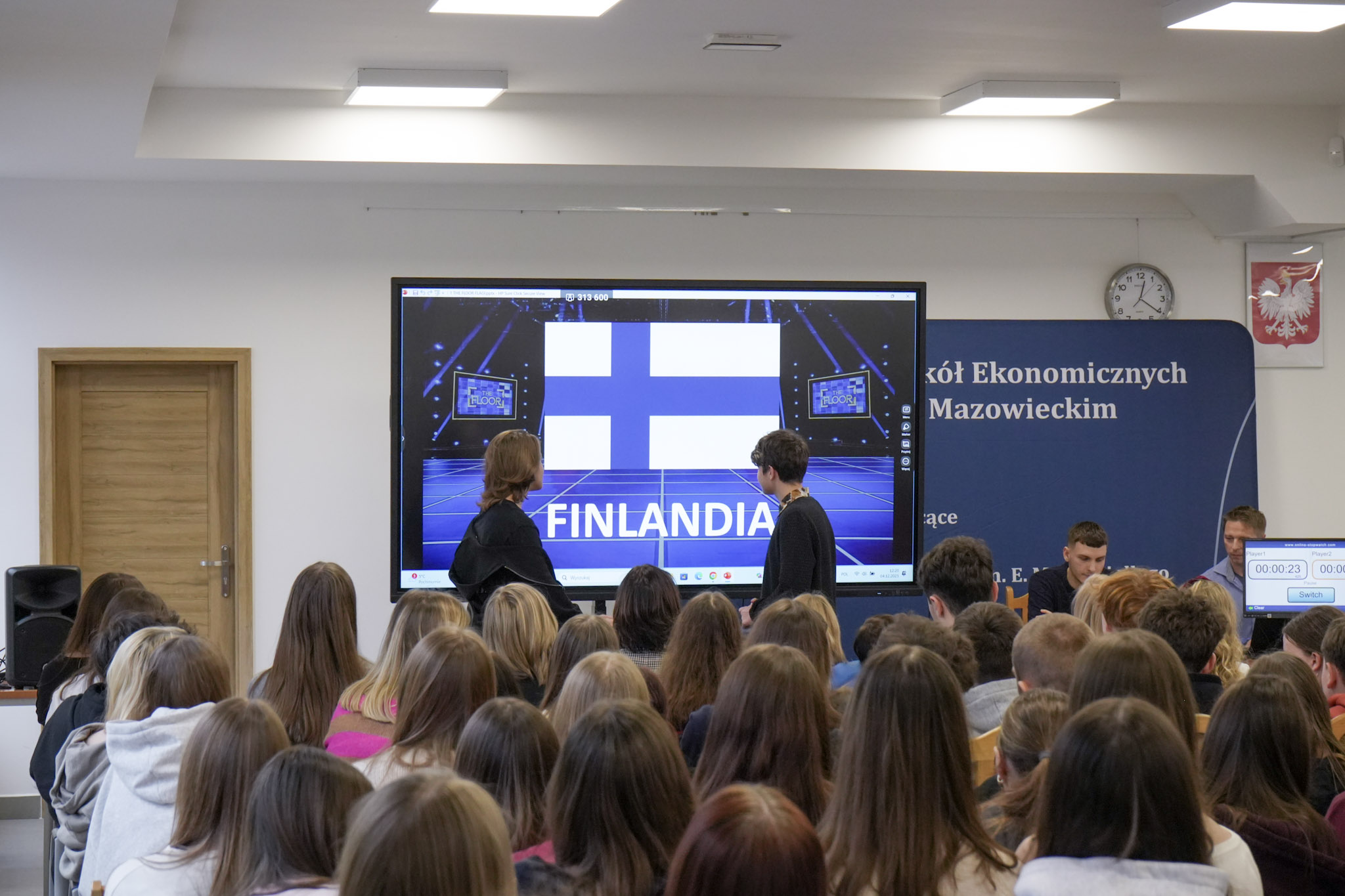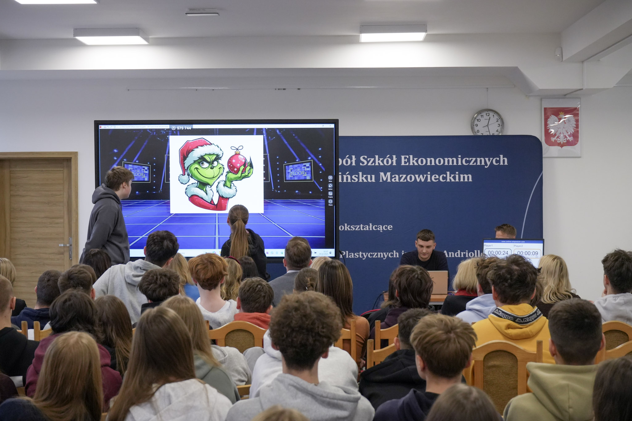 Podsumowanie X Powiatowego Konkursu Poliglotów zostało przygotowane przez uczniów klasy 1D i klasy 3F1 Zespołu Szkół Ekonomicznych, a wydarzenie poprowadziła Wiktoria Sęktas z klasy 4C. Najważniejszym punktem programu była gra „The Floor”, w której wylosowani przez „podłogę” uczniowie rywalizowali w pięciu kategoriach: flagi, postacie z bajek, Boże Narodzenie, jaki to kraj oraz język angielski. Zmagania dostarczyły wiele emocji i świetnej zabawy zarówno uczestnikom, jak i publiczności.