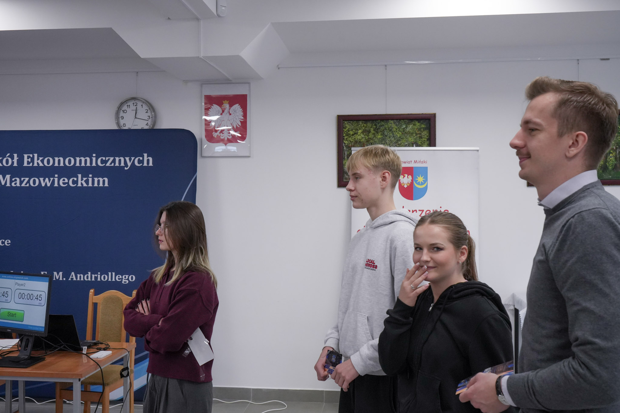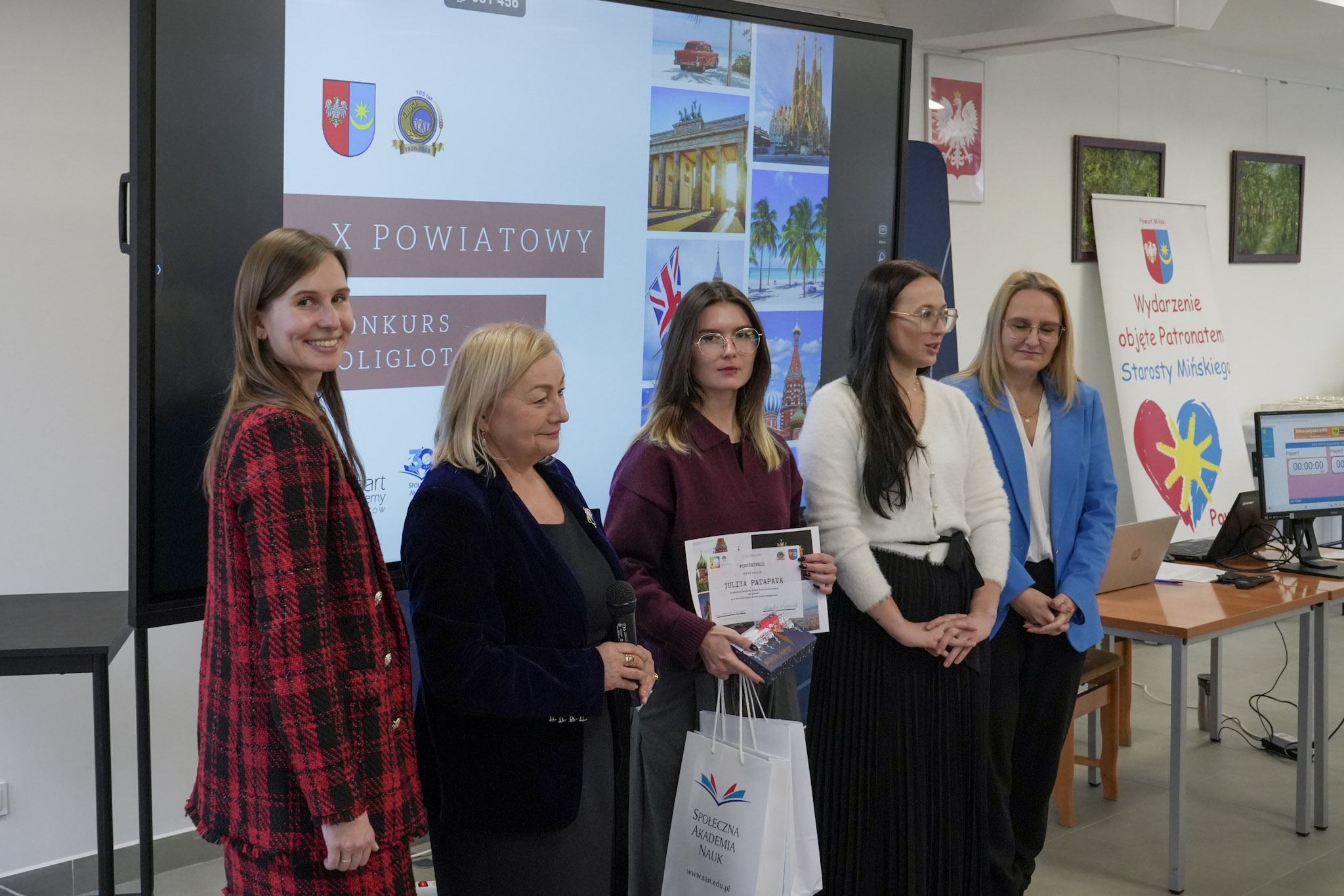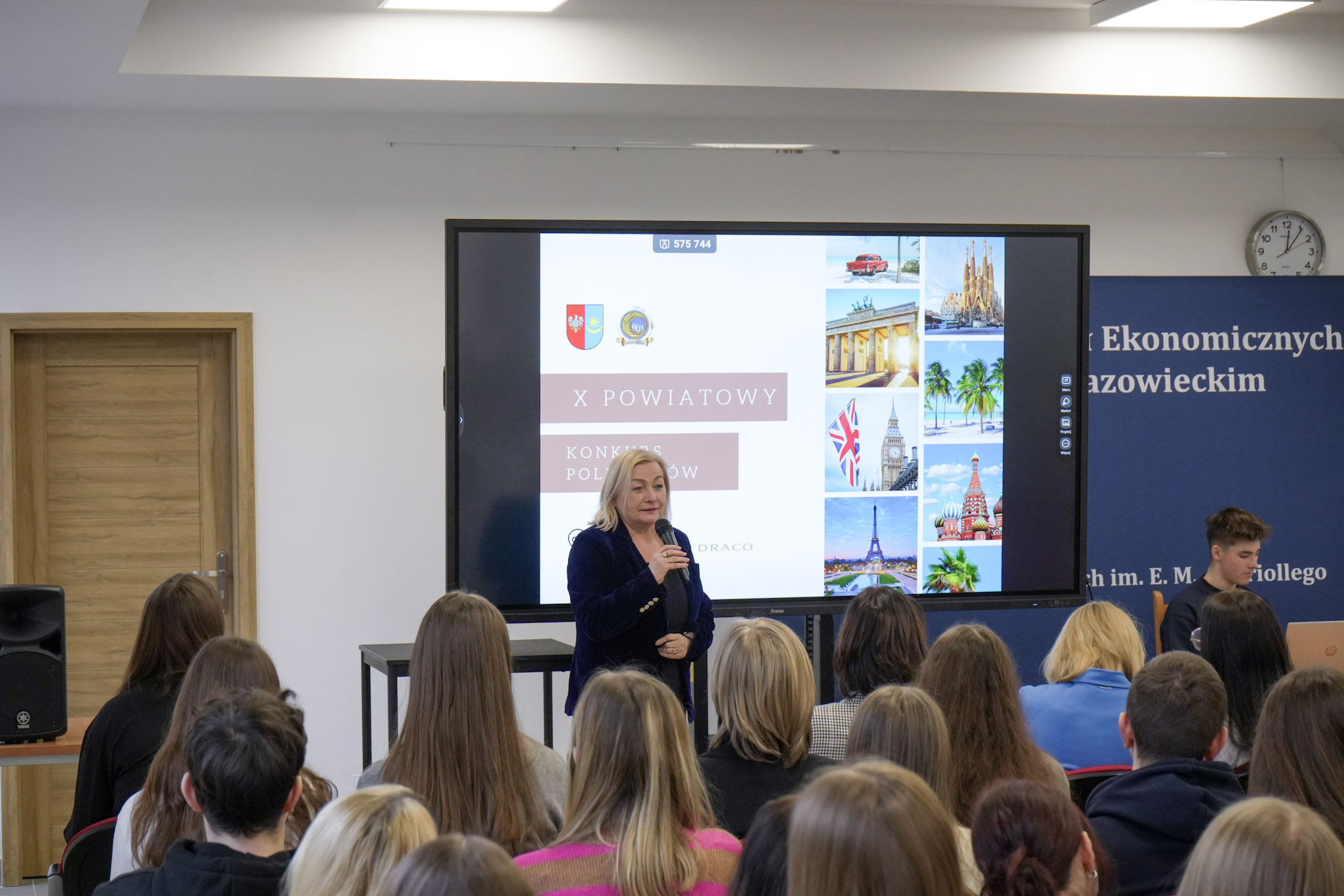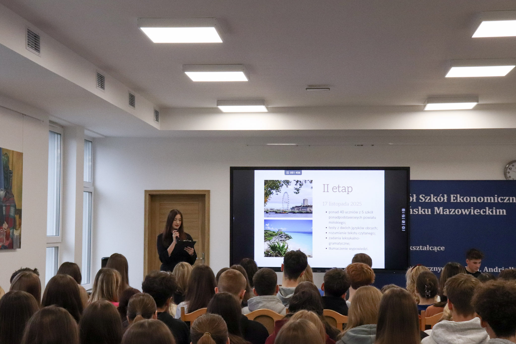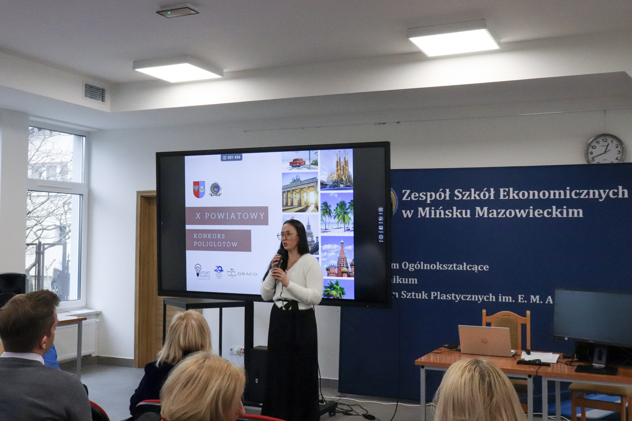 4 grudnia 2025 roku w Zespole Szkół Ekonomicznych odbyło się podsumowanie X Powiatowego Konkursu Poliglotów. W uroczystości wzięli udział: pani Urszula Pacyga (Wicestarosta Powiatu Mińskiego), pani Edyta Chłopik (Dyrektor Biura Oświaty), pani Marlena Pustoła (Dyrektor Zespołu Szkół im. Marii Skłodowskiej-Curie), pani Paulina Woroncow ze szkoły językowej Smart Academy (główny sponsor konkursu) oraz pani Elżbieta Zofia Wieczorek (Dyrektor Zespołu Szkół Ekonomicznych), laureaci X Powiatowego Konkursu Poliglotów wraz z opiekunami oraz uczniowie ZSE.