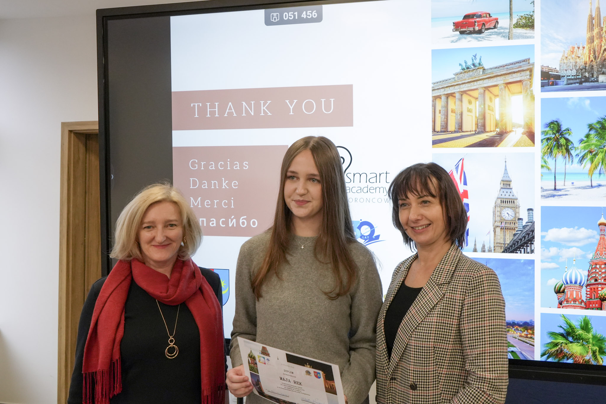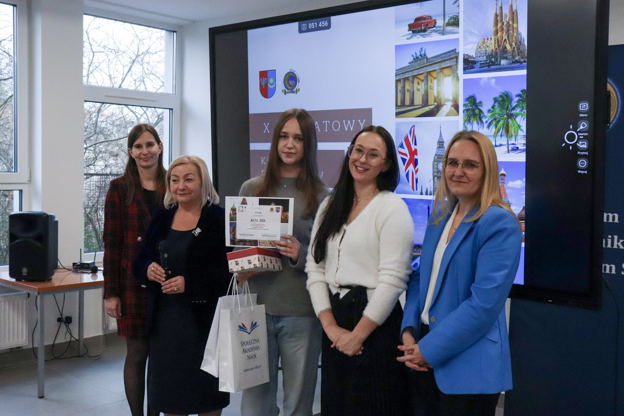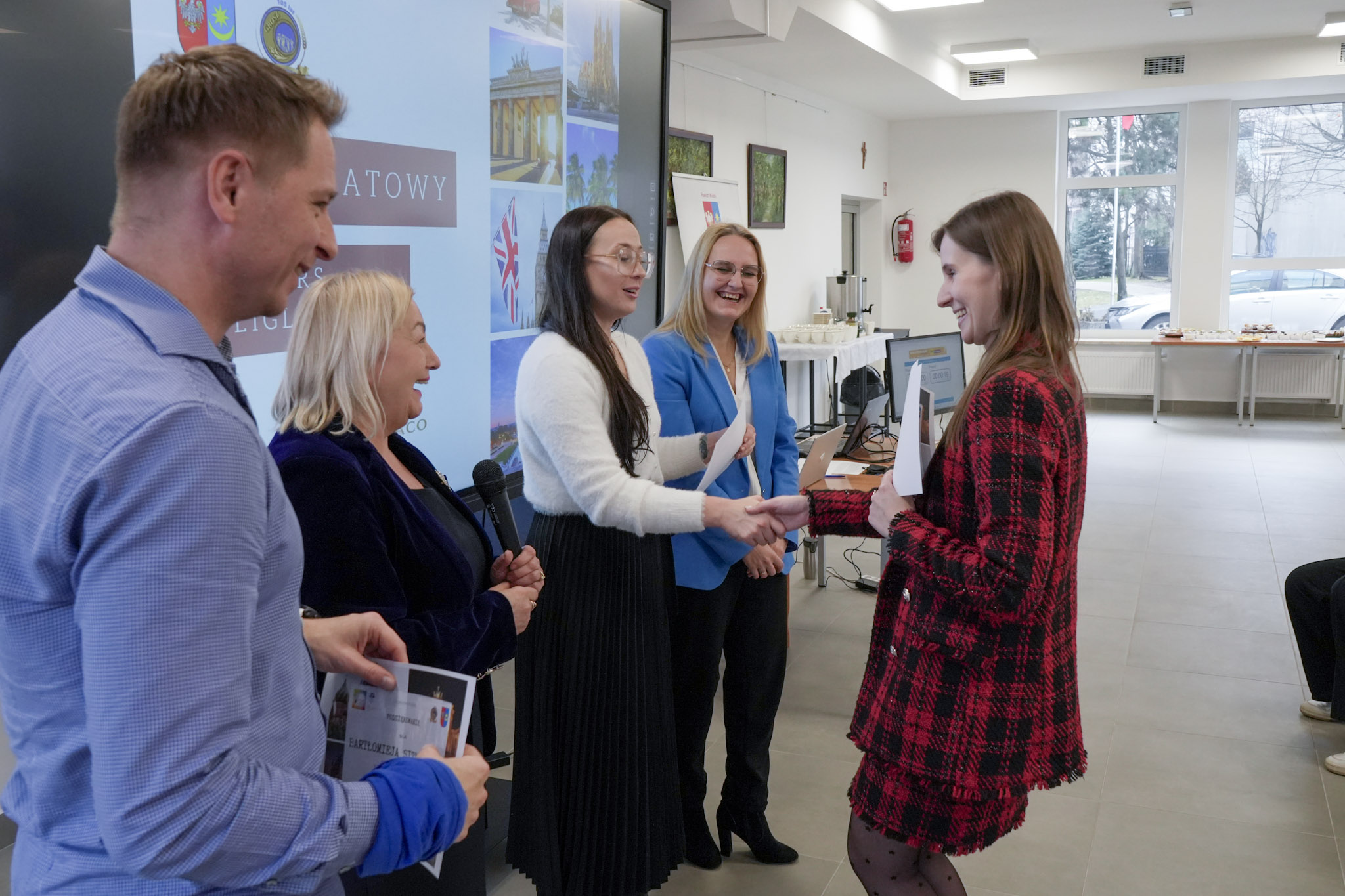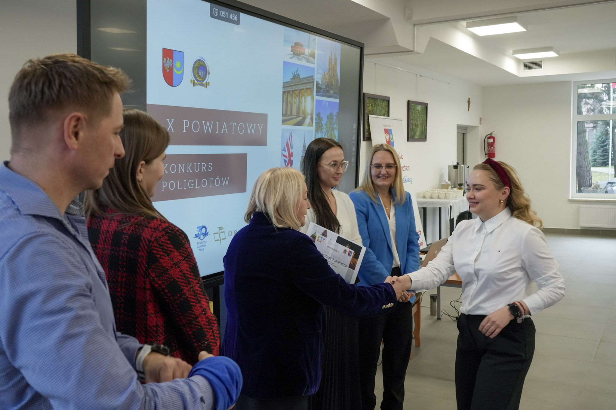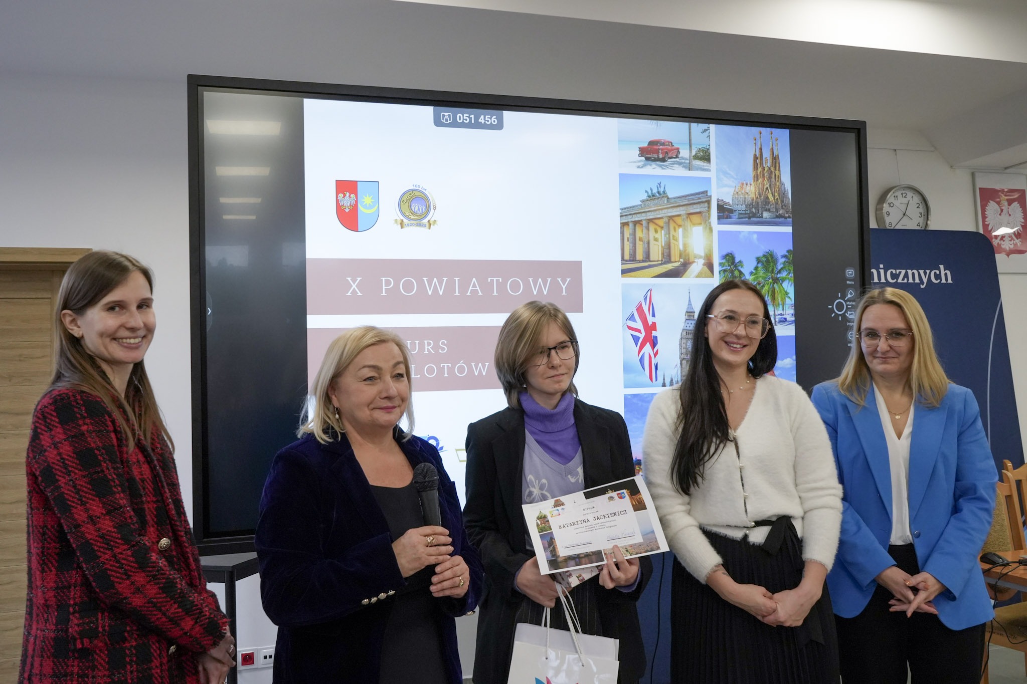 4 grudnia 2025 roku w Zespole Szkół Ekonomicznych odbyło się podsumowanie X Powiatowego Konkursu Poliglotów. W uroczystości wzięli udział: pani Urszula Pacyga (Wicestarosta Powiatu Mińskiego), pani Edyta Chłopik (Dyrektor Biura Oświaty), pani Marlena Pustoła (Dyrektor Zespołu Szkół im. Marii Skłodowskiej-Curie), pani Paulina Woroncow ze szkoły językowej Smart Academy (główny sponsor konkursu) oraz pani Elżbieta Zofia Wieczorek (Dyrektor Zespołu Szkół Ekonomicznych), laureaci X Powiatowego Konkursu Poliglotów wraz z opiekunami oraz uczniowie ZSE.